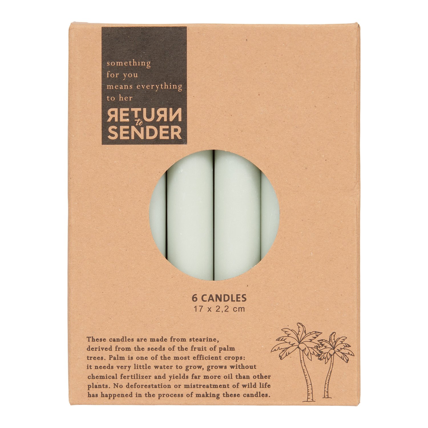 De kaarsen worden geproduceerd in Indonesië en zijn gemaakt van stearine, gewonnen uit de zaden van de vrucht van duurzaam geplante palmbomen. Tijdens het hele proces heeft geen ontbossing plaatsgevonden of is op andere wijze schade aan flora en fauna toegebracht.